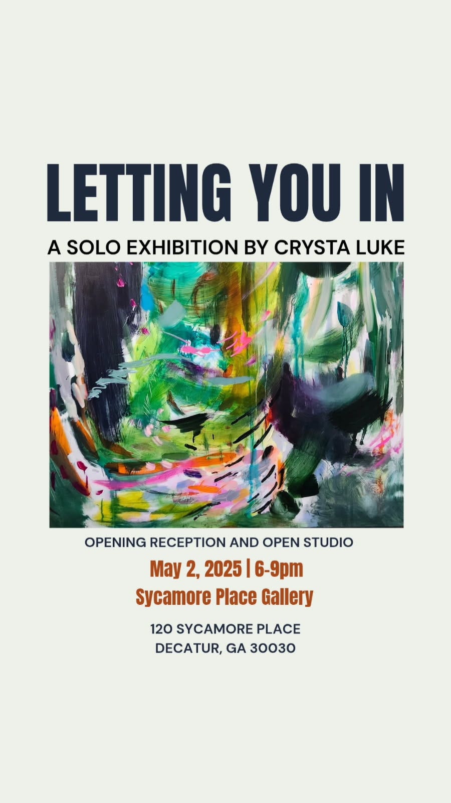 Join us this Friday night for the Decatur Art Walk! Sycamore Place Gallery will be open this Friday, May 2, 6-9 p.m. for the opening of a solo exhibition by Crysta Luke. (Scroll to the bottom to see the flyer) Have a complementary glass of wine and explore open studios from the artists of the connecting Sycamore Place Studios. Street parking is limited, so walking, ride-share, or being a paying customer at neighboring Felini’s pizza might be the best bet. Children are welcome! We will have sidewalk chalk on hand for doodling on the courtyard floor. Hope to see some of you there!
